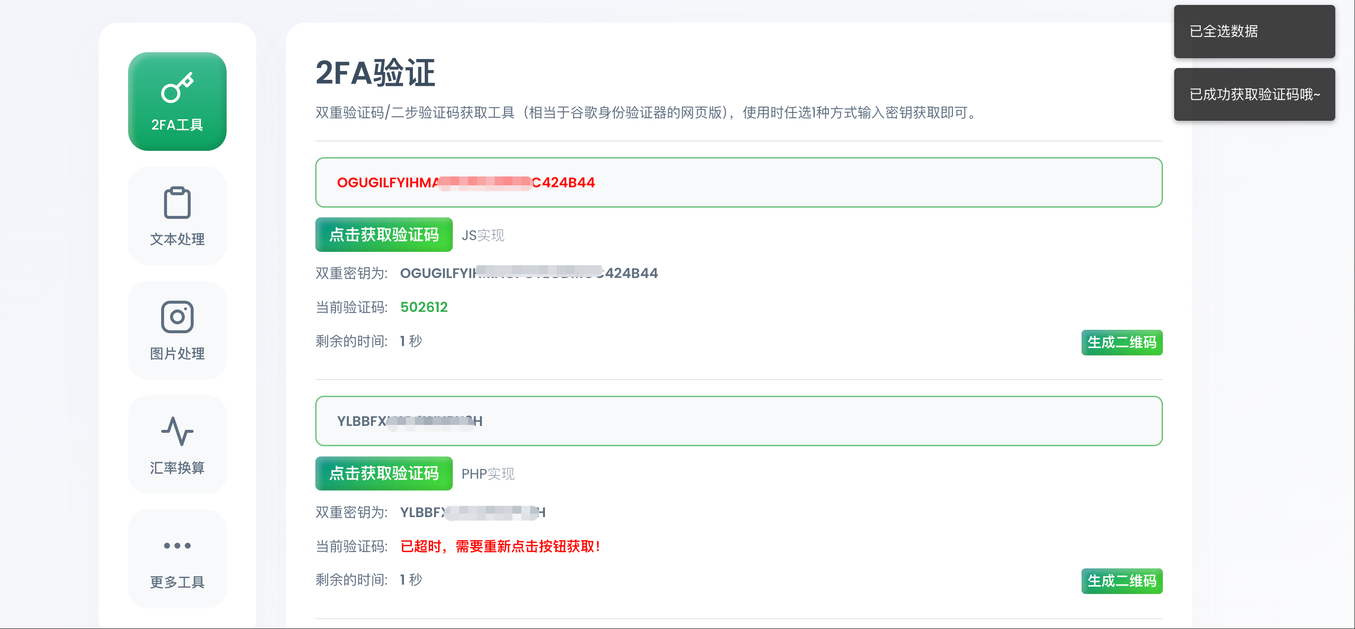 在页面输入账号附带的固定密钥(例如:类似ISROQBCCHTQQBINYQDRPKAOYIZORSYAB的字符串),即可实时显示当前动态验证码。