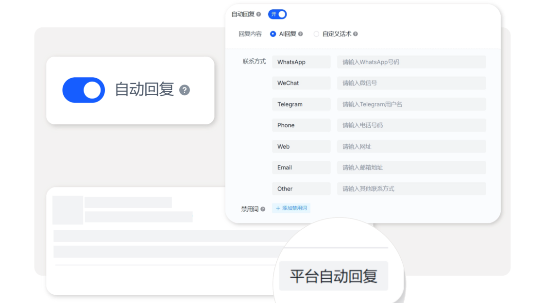 你可以预设语气、关键联系方式和禁用词,AI 会自动生成智能且符合品牌调性的回复。让你第一时间掌握用户真实声音,并在用户需要你的时刻快速把握住互动转化的机会。遇到简单问题,系统直接处理;遇到复杂评论,你再人工接手即可。