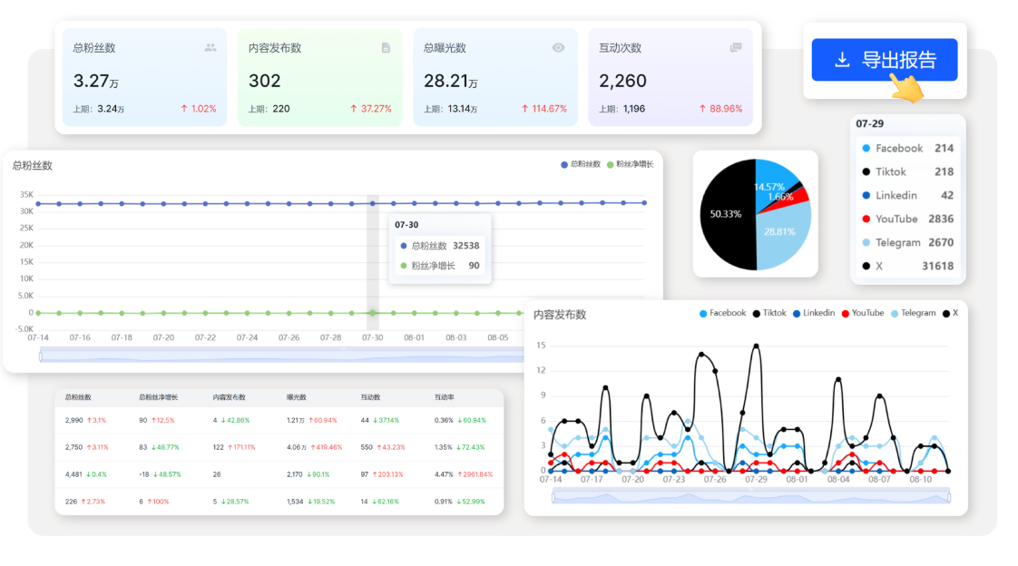 4.1 支持自家账号和竞品账号数据追踪。粉丝数、内容量、曝光量、互动量……所有平台数据实时汇总一屏呈现,社交矩阵表现;趋势变化一目了然;同时支持将目标竞品纳入监测,实现自家与竞品的横向对比。