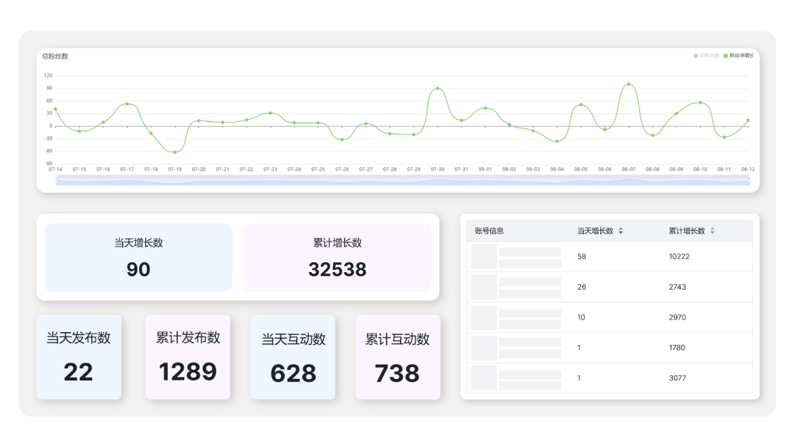 4.3 支持多层次维度。平台层 → 账号层 → 内容层,清晰呈现数据结构,管理层能把握矩阵级别的宏观趋势,运营者能深入单账号与单篇内容的细节。