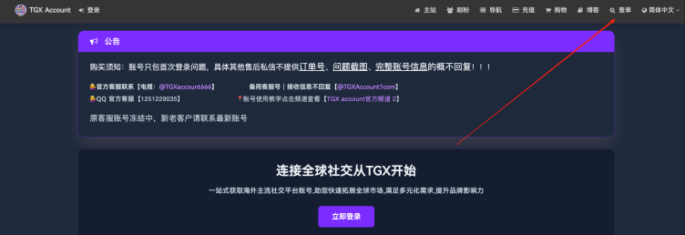 点击 TGXaccount 平台右上角的查单(未注册的无法查看)