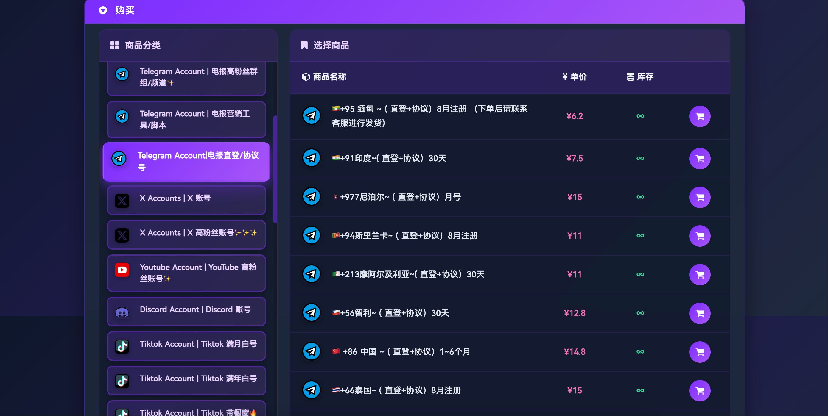供应优势: 我们提供海量的协议号库存,确保客户能够进行大规模的批量采购和部署。我们理解客户对价格便宜、无需养号、直登无需手机号的需求,并提供如缅甸号 ¥6.2、印度号 ¥7.5、美国半年号 ¥21等极具竞争力的产品。
