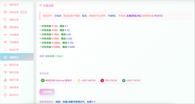 • 多种支付方式: 微信、支付宝、USDT(TRC20/BEP20)