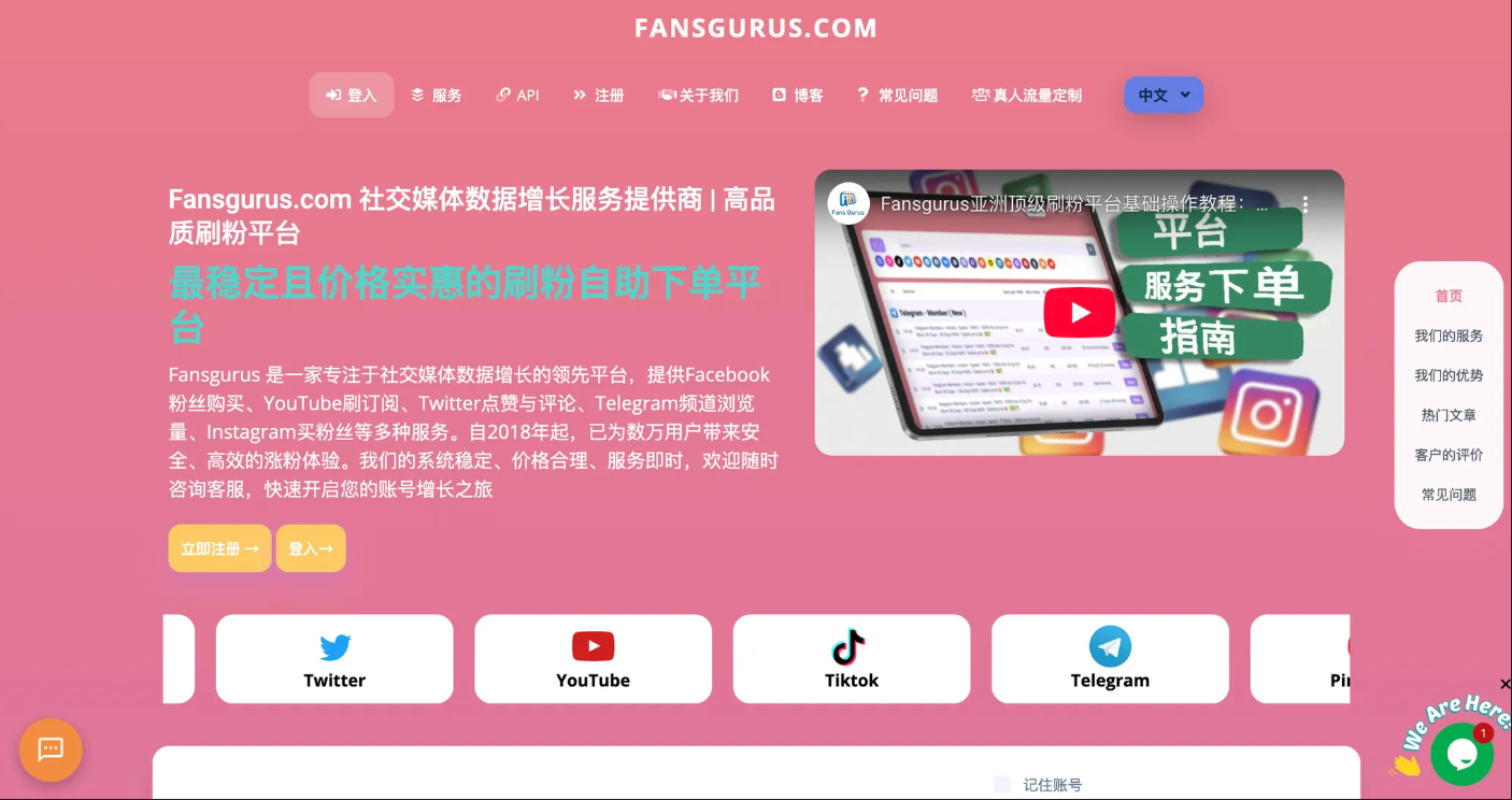 平台简介: Fansgurus成立于2018年,是一家全球化的社交媒体营销(SMM)服务平台,专注于帮助个人创作者、中小企业、营销机构快速提升社交媒体影响力。平台覆盖TikTok、Instagram、YouTube、Twitter/X、Telegram、Facebook、Discord、Spotify、Twitch、LinkedIn等20%2B主流社交平台。