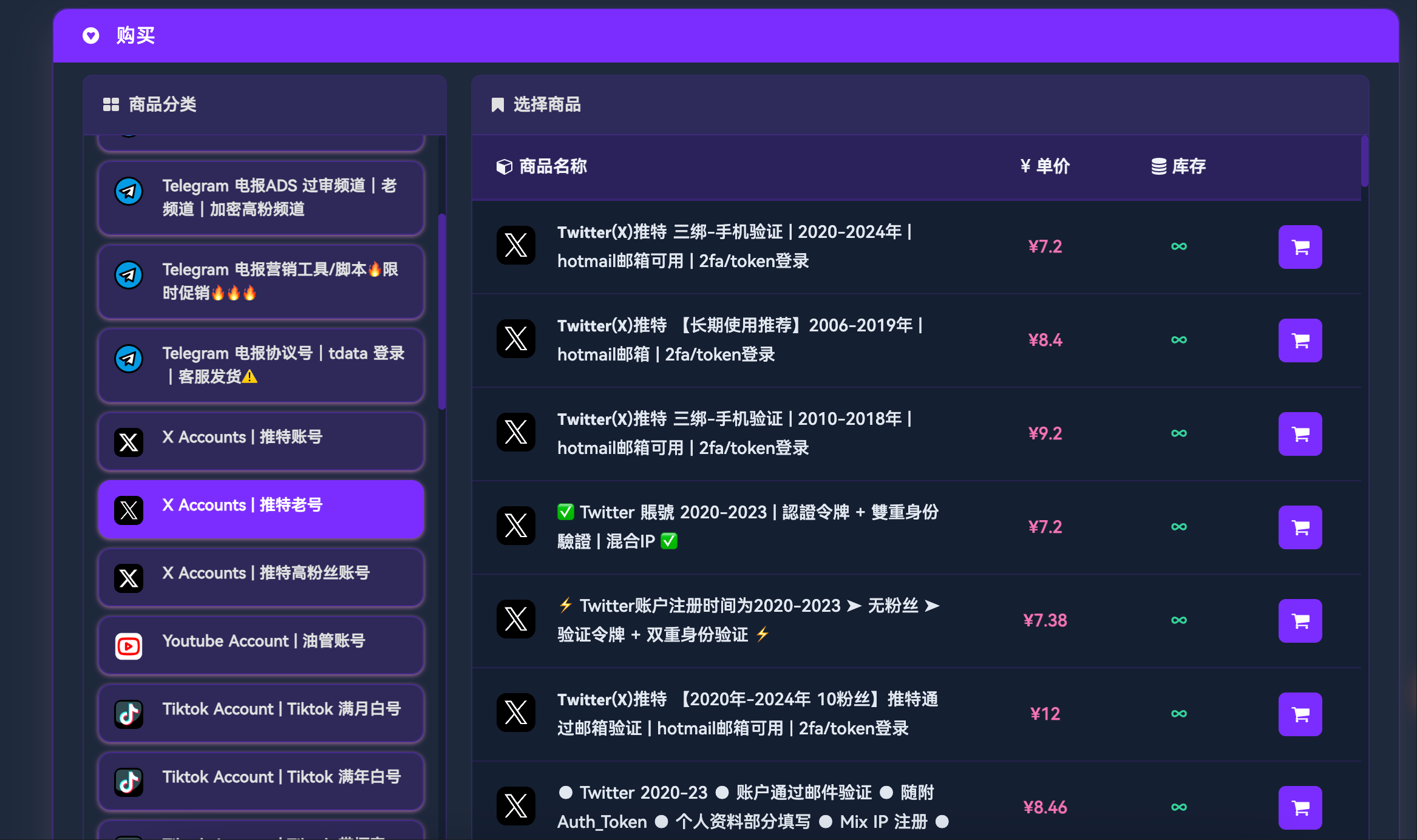 原本以游戏账号为主,近年增加社交账号供应,价格实惠、上架快,但Twitter老号数量较少,多为中龄号,稳定性中等,适合预算有限的新手尝试。