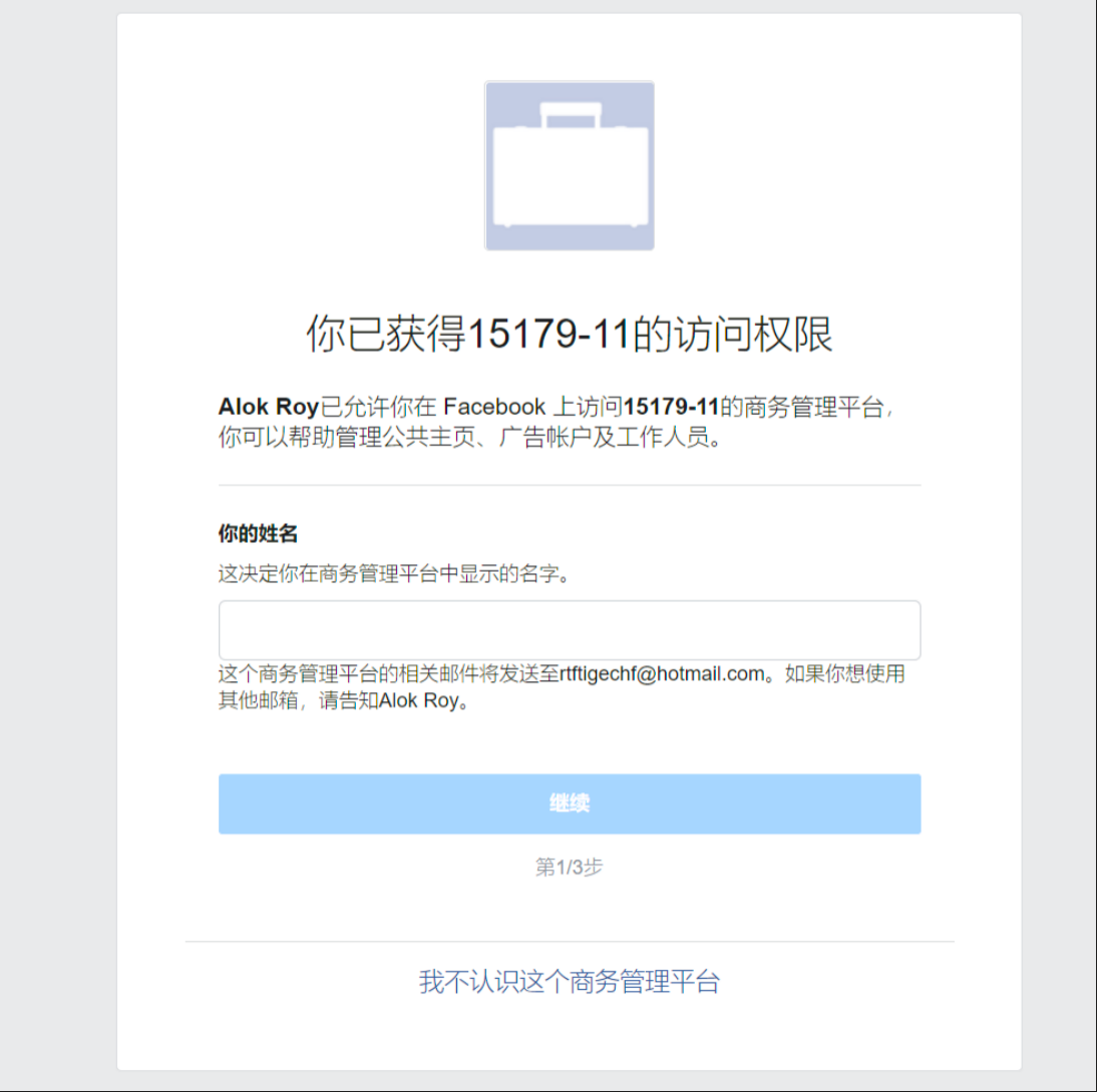 复制其中一个邀请链接,到需要接受的FB账户的同一个游览器,任意窗口打开即可,注意fb账号需不受限才可以接受BM。复制链接打开后会看到一个这样的界面