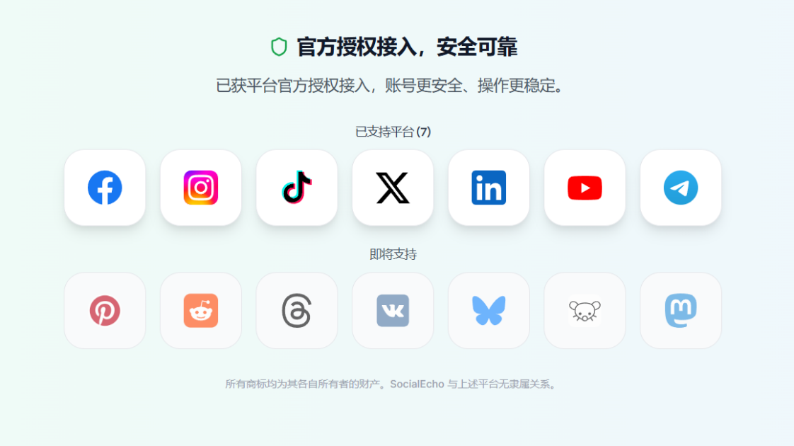 Socialecho一款基于官方 API的AI 驱动社交媒体多账号管理平台,目前已支持7大主流平台:FaceBook、Instagram、X(Twitter)、TikTok、YouTube、Telegram、LinkedIn