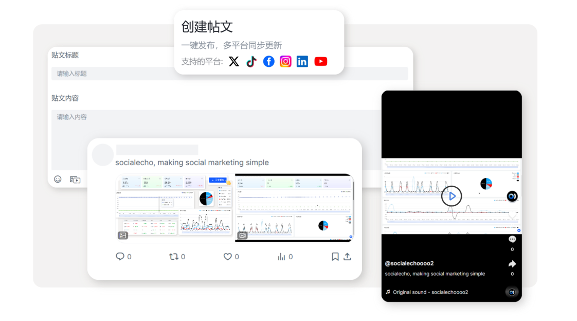 用户可以在SocialEcho上管理内容日程、发布内容、回复评论/私信、进行账号分析、社媒舆情监控以及竞品追踪等,无需多个平台多个账号来回切换,一个SocialEcho搞定你的海外社媒运营。