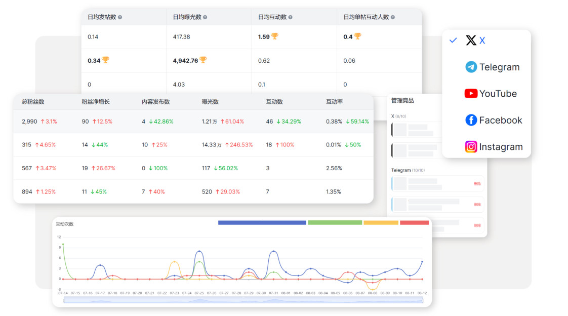 4.1 支持自家账号和竞品账号数据追踪。粉丝数、内容量、曝光量、互动量……所有平台数据实时汇总一屏呈现,社交矩阵表现;趋势变化一目了然;同时支持将目标竞品纳入监测,实现自家与竞品的横向对比。