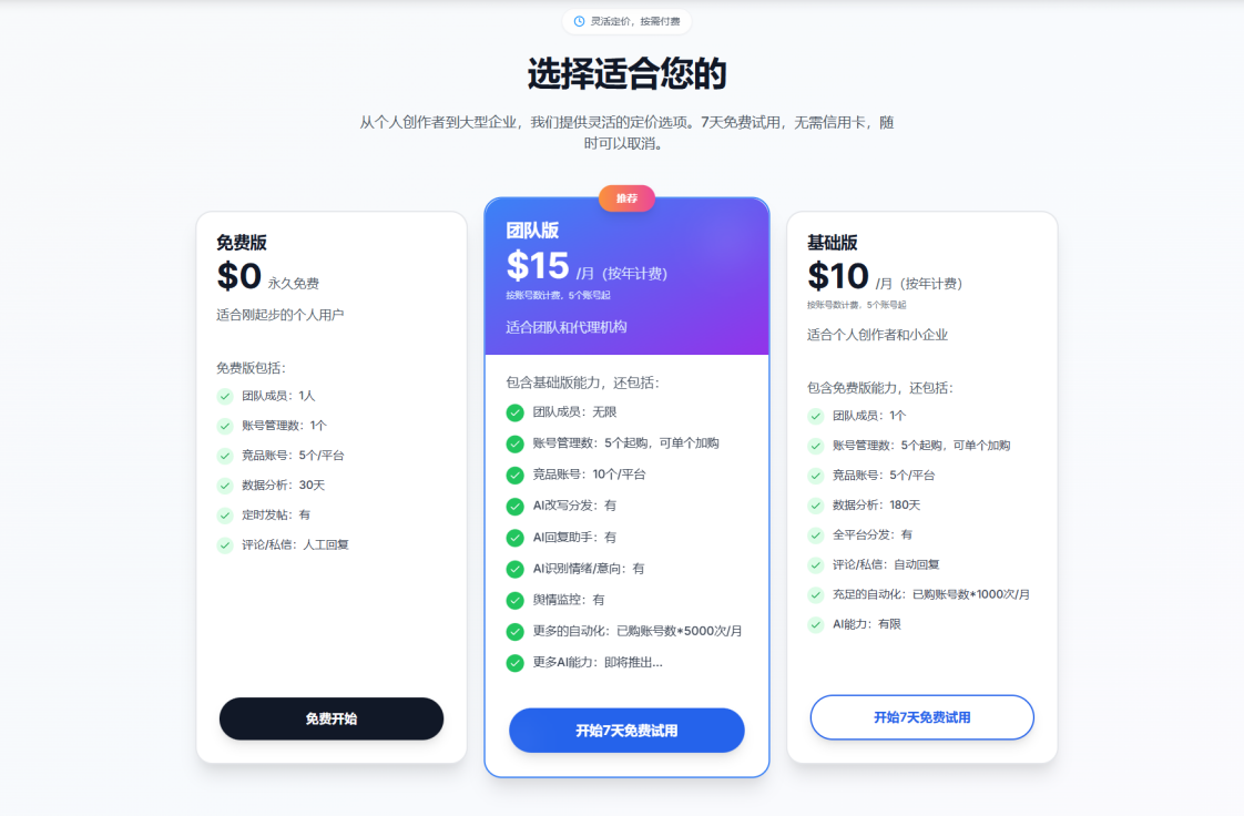 您可以享受1个频道的永久免费,如果您需要集中管理多个频道和更强大的功能,推荐订阅socialecho套餐