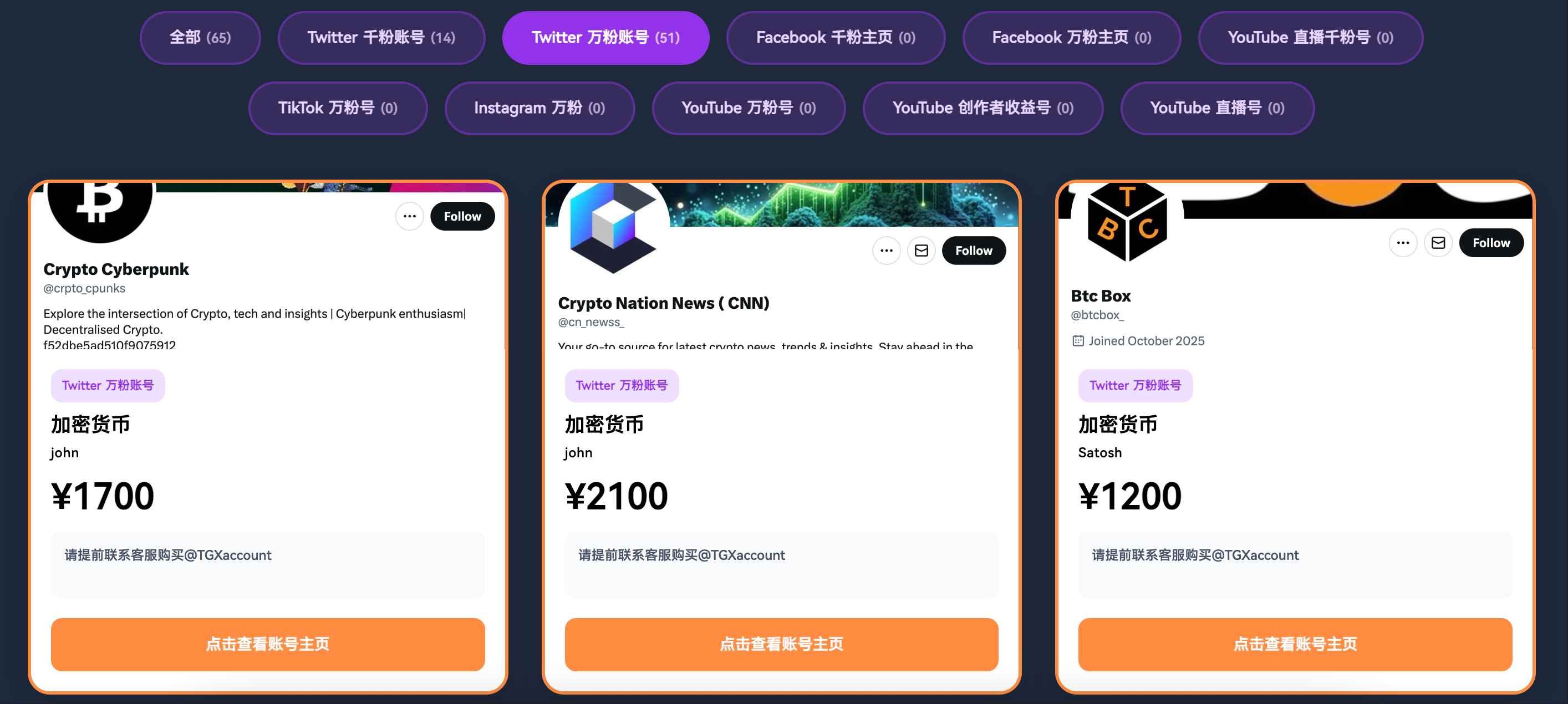 TGX 平台 友情提醒:在加密圈,粉丝数就是公信力。我们提供的 推特高权重账号,是你的项目实现“一键脱贫”的神器。停止你的“长期主义”幻想,用 TGX 的大号直接空降加密舆论场,用影响力收割关注度!